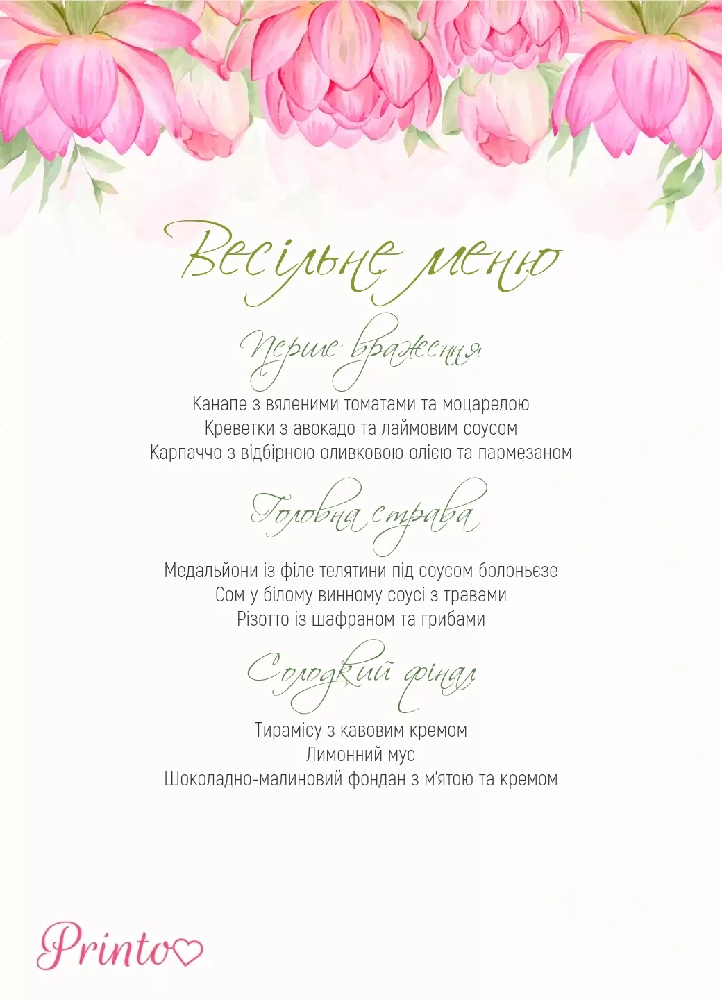 На листі меню зазвичай вказують страви, які будуть подані на весіллі, а також напої і десерти.