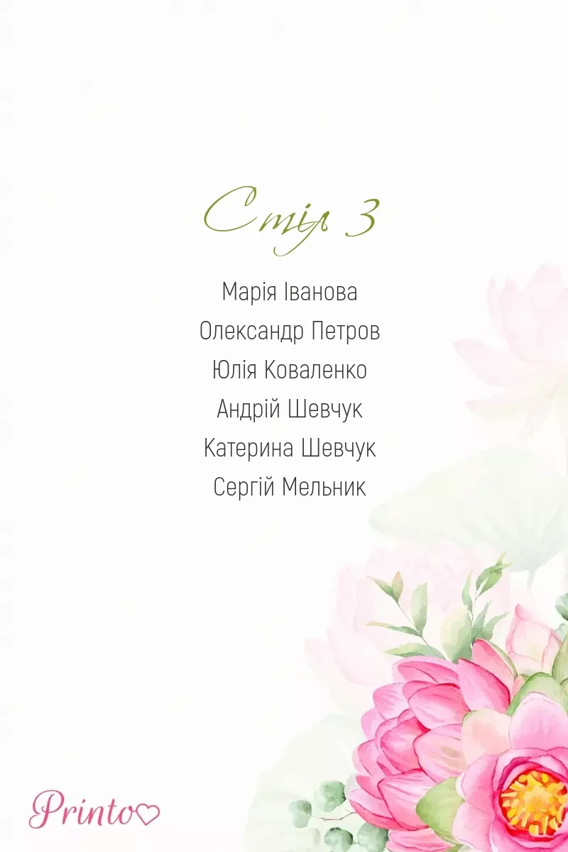 Ці карточки розміщуються на столах і допомагають гостям знайти своє місце. На карточці зазвичай вказується ім'я гостя.