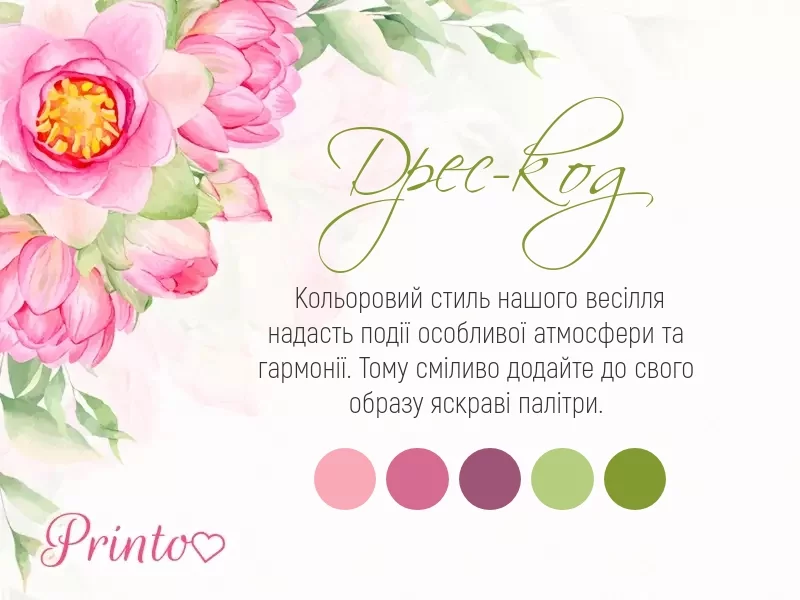 Вкажіть, який дрес-код бажаний на вашому весіллі. Вставте на слайд палітру кольорів, які будуть переважати на весіллі.