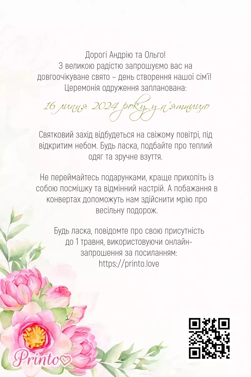 На листі може бути персональне посилання, а також QR-код на іменне цифрове запрошення. Таким чином гості, які отримали друковане запрошення, зможуть дізнатися більше про весілля і підтвердити присутність онлайн.