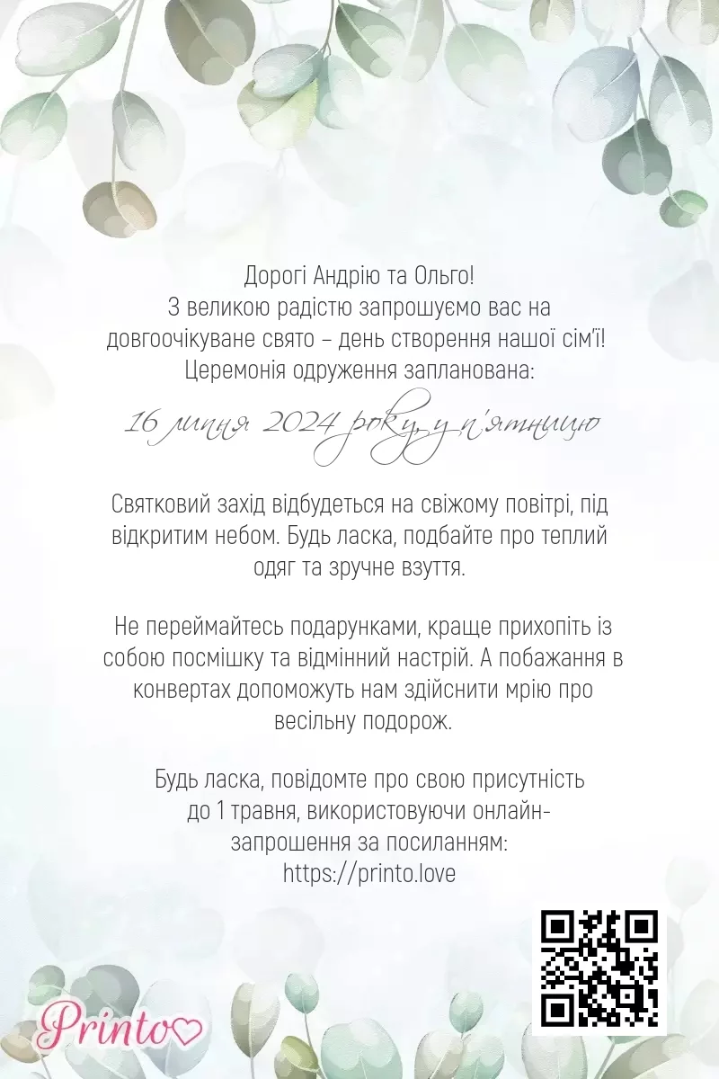 На листі може бути персональне посилання, а також QR-код на іменне цифрове запрошення. Таким чином гості, які отримали друковане запрошення, зможуть дізнатися більше про весілля і підтвердити присутність онлайн.