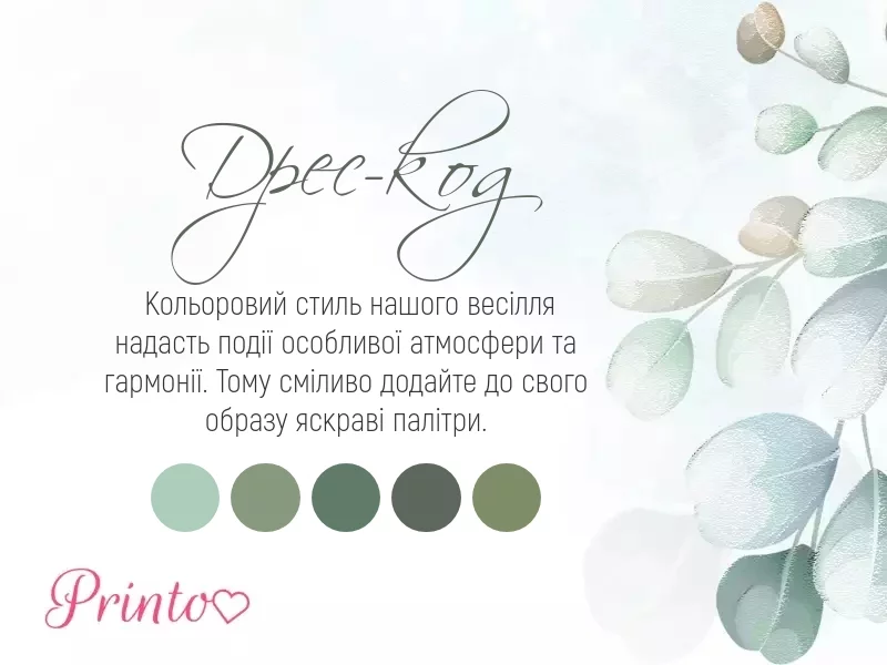 Вкажіть, який дрес-код бажаний на вашому весіллі. Вставте на слайд палітру кольорів, які будуть переважати на весіллі.