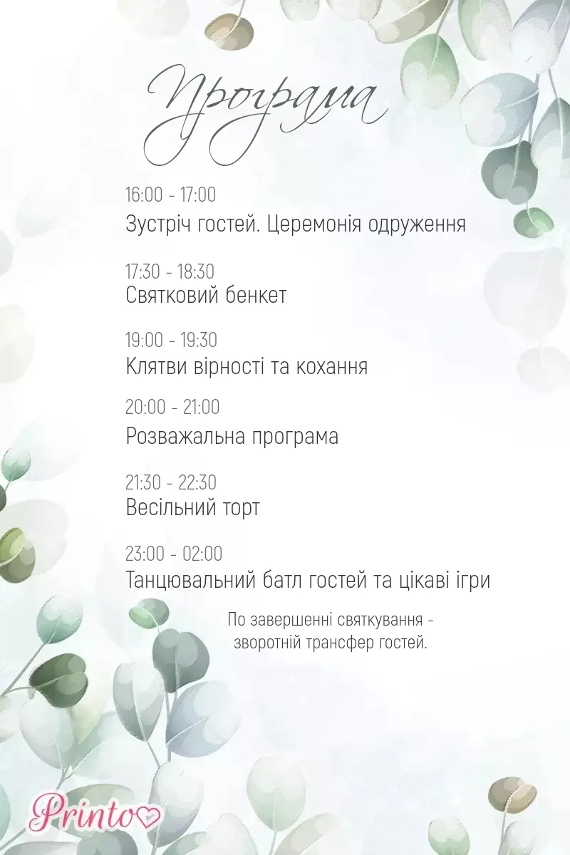 Розкажіть гостям про програму весілля. Вкажіть час початку і закінчення, а також основні заходи.