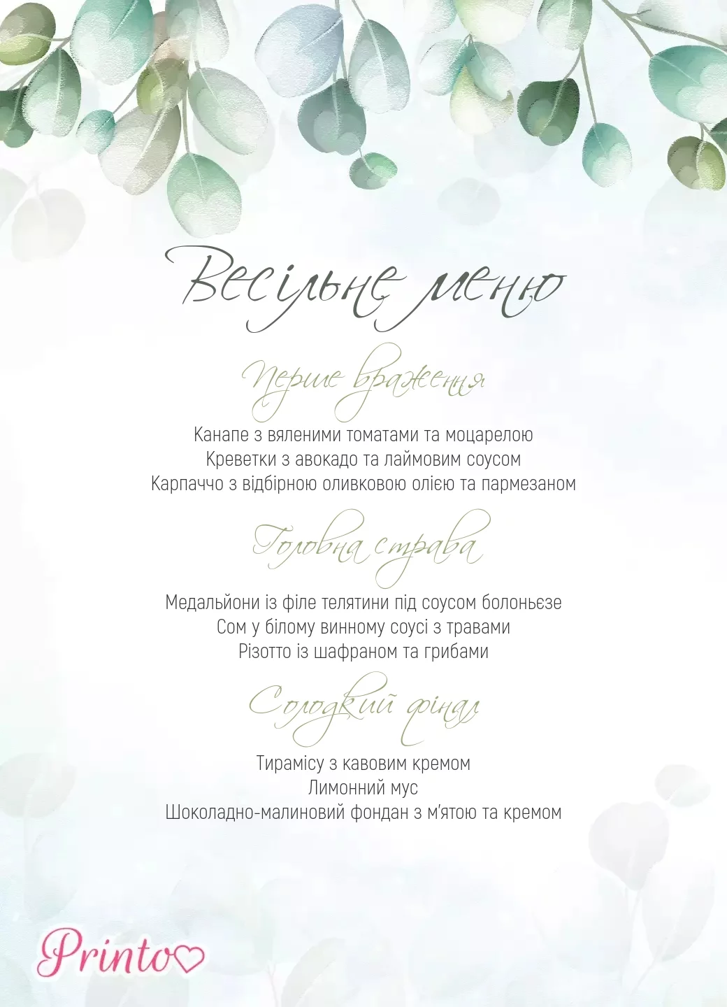 На листі меню зазвичай вказують страви, які будуть подані на весіллі, а також напої і десерти.