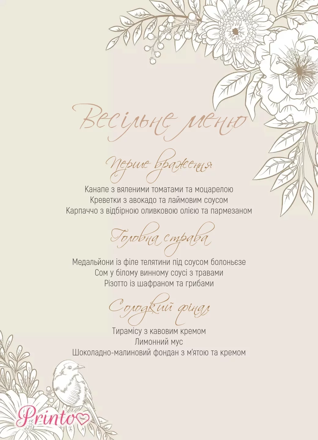 На листі меню зазвичай вказують страви, які будуть подані на весіллі, а також напої і десерти.