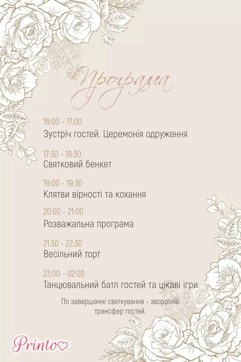 Розкажіть гостям про програму весілля. Вкажіть час початку і закінчення, а також основні заходи.
