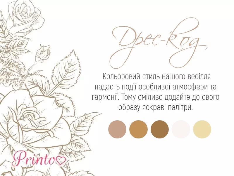 Вкажіть, який дрес-код бажаний на вашому весіллі. Вставте на слайд палітру кольорів, які будуть переважати на весіллі.