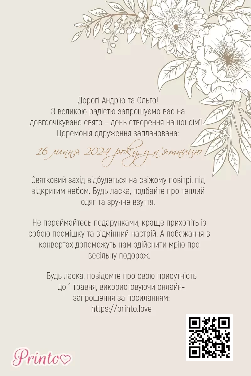 На листі може бути персональне посилання, а також QR-код на іменне цифрове запрошення. Таким чином гості, які отримали друковане запрошення, зможуть дізнатися більше про весілля і підтвердити присутність онлайн.