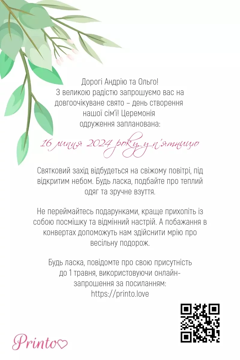 На листі може бути персональне посилання, а також QR-код на іменне цифрове запрошення. Таким чином гості, які отримали друковане запрошення, зможуть дізнатися більше про весілля і підтвердити присутність онлайн.