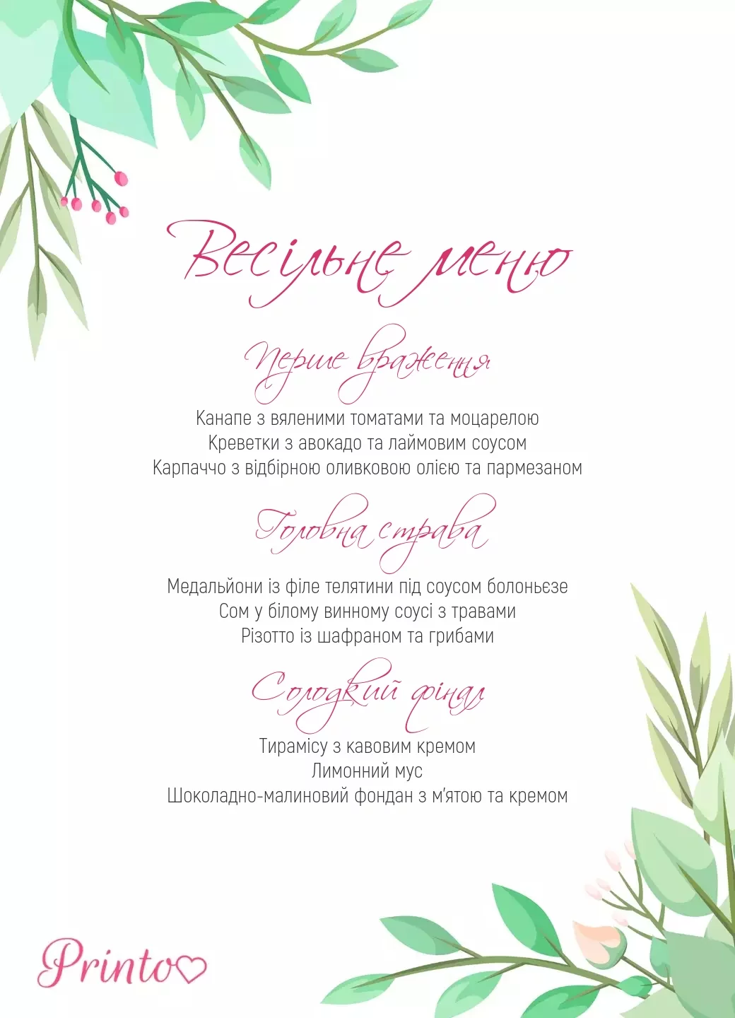 На листі меню зазвичай вказують страви, які будуть подані на весіллі, а також напої і десерти.