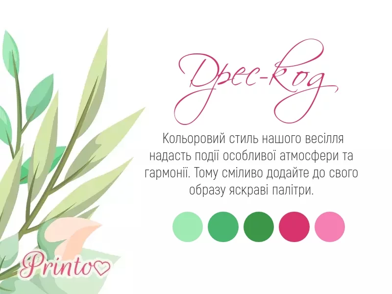 Вкажіть, який дрес-код бажаний на вашому весіллі. Вставте на слайд палітру кольорів, які будуть переважати на весіллі.