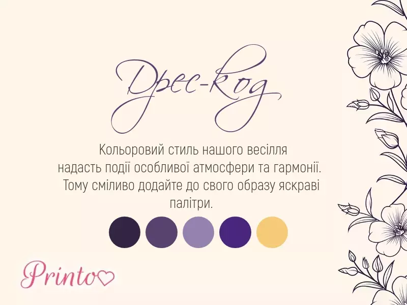Вкажіть, який дрес-код бажаний на вашому весіллі. Вставте на слайд палітру кольорів, які будуть переважати на весіллі.