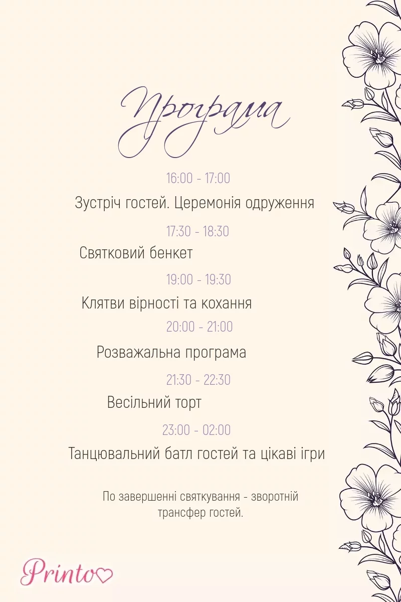 Розкажіть гостям про програму весілля. Вкажіть час початку і закінчення, а також основні заходи.
