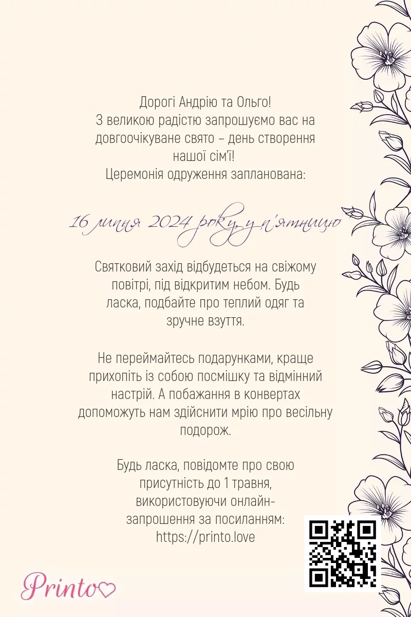 На листі може бути персональне посилання, а також QR-код на іменне цифрове запрошення. Таким чином гості, які отримали друковане запрошення, зможуть дізнатися більше про весілля і підтвердити присутність онлайн.