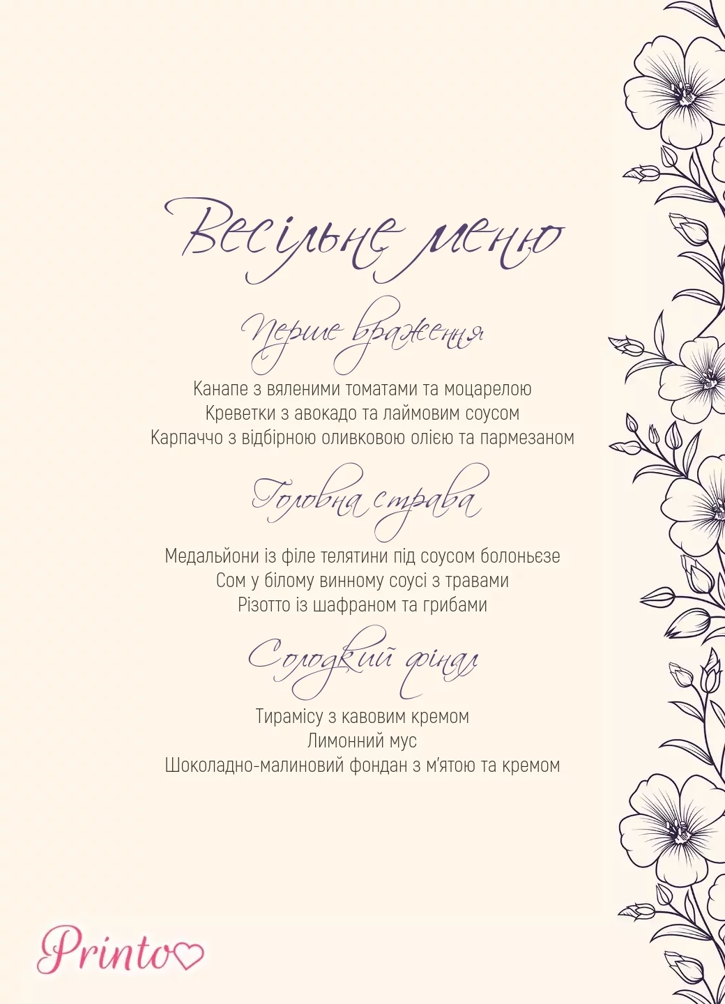На листі меню зазвичай вказують страви, які будуть подані на весіллі, а також напої і десерти.
