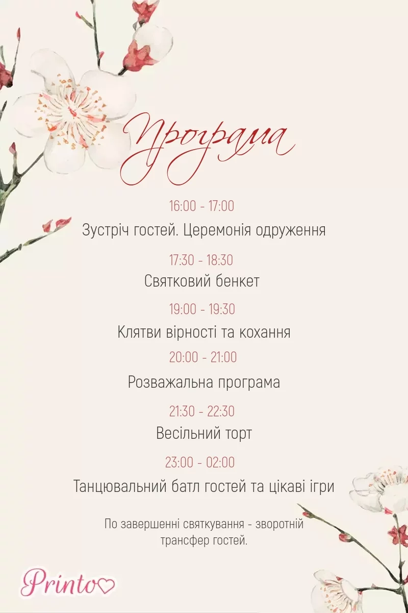 Розкажіть гостям про програму весілля. Вкажіть час початку і закінчення, а також основні заходи.
