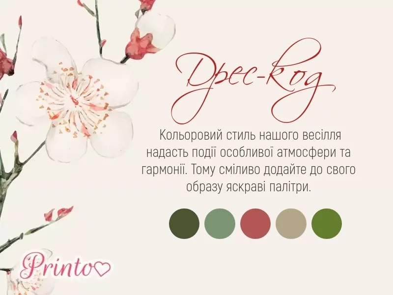 Вкажіть, який дрес-код бажаний на вашому весіллі. Вставте на слайд палітру кольорів, які будуть переважати на весіллі.