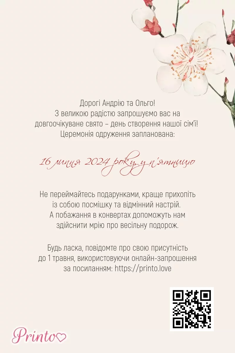 На листі може бути персональне посилання, а також QR-код на іменне цифрове запрошення. Таким чином гості, які отримали друковане запрошення, зможуть дізнатися більше про весілля і підтвердити присутність онлайн.