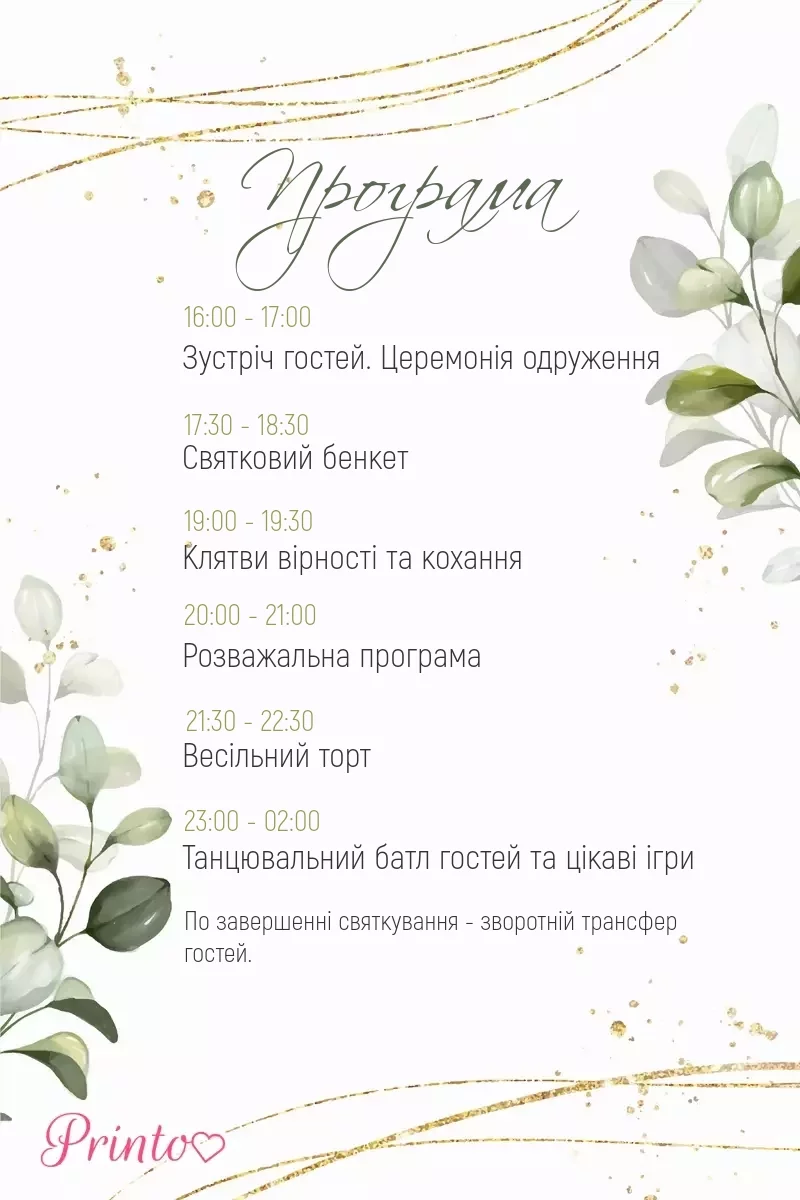 Розкажіть гостям про програму весілля. Вкажіть час початку і закінчення, а також основні заходи.
