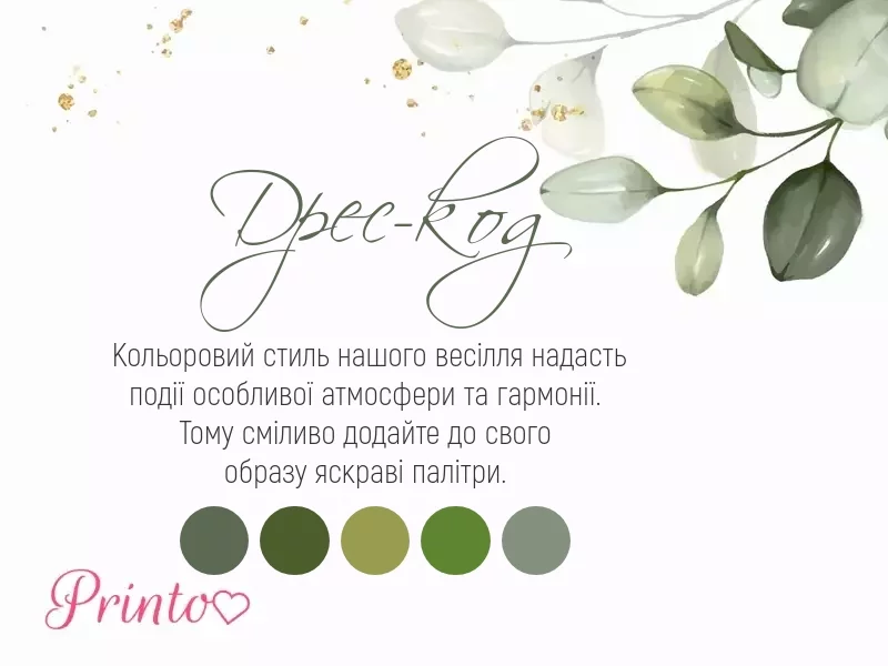 Вкажіть, який дрес-код бажаний на вашому весіллі. Вставте на слайд палітру кольорів, які будуть переважати на весіллі.