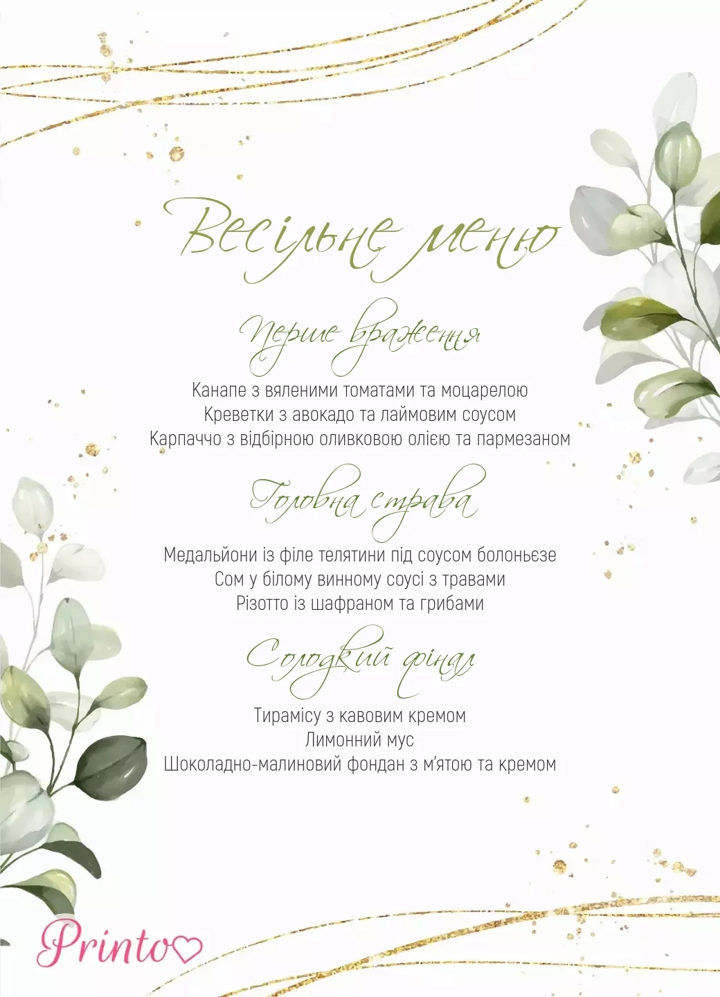 На листі меню зазвичай вказують страви, які будуть подані на весіллі, а також напої і десерти.