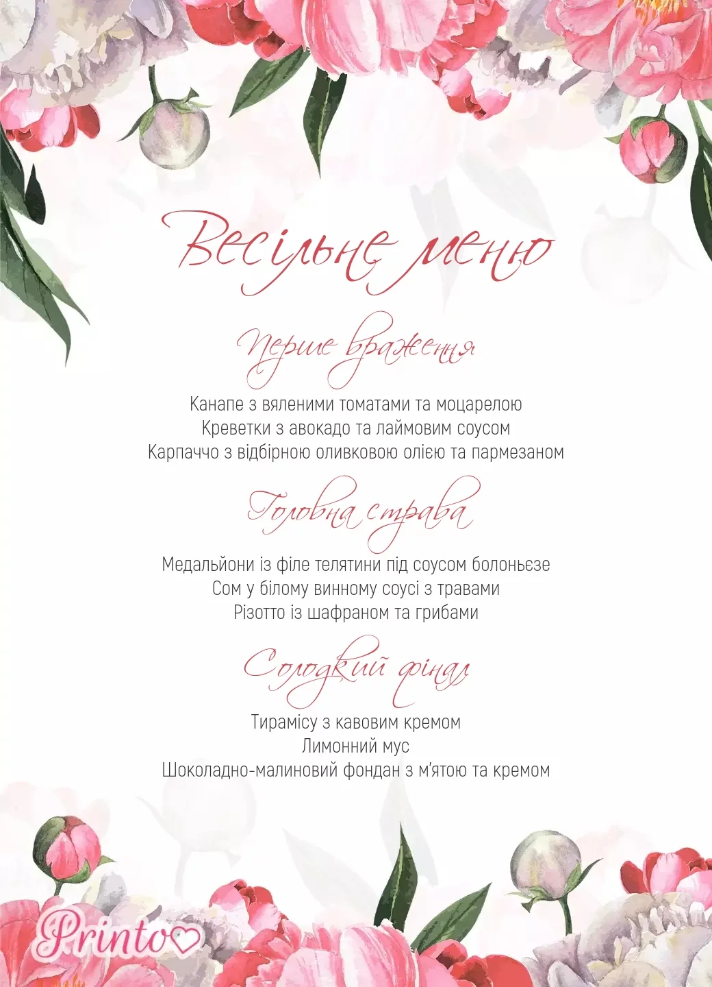 На листі меню зазвичай вказують страви, які будуть подані на весіллі, а також напої і десерти.