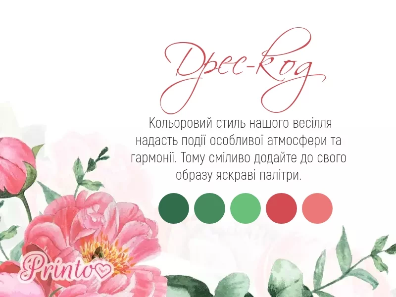 Вкажіть, який дрес-код бажаний на вашому весіллі. Вставте на слайд палітру кольорів, які будуть переважати на весіллі.