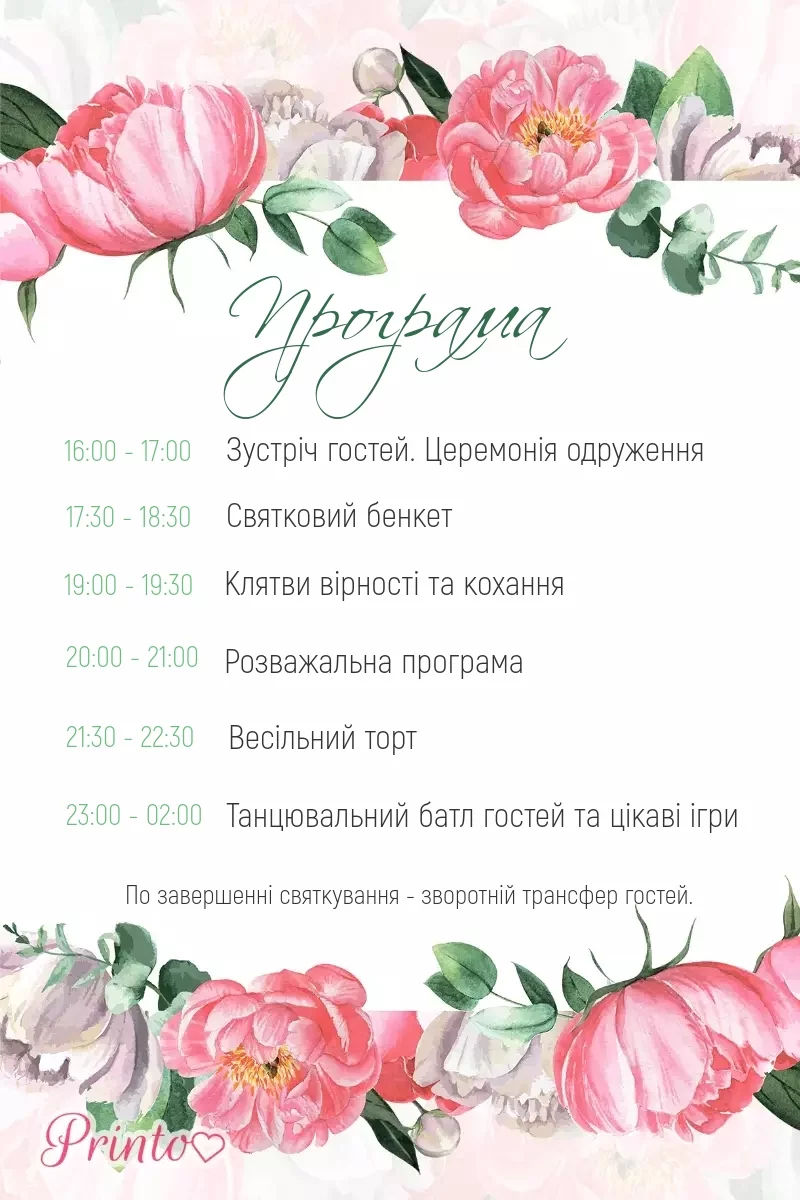 Розкажіть гостям про програму весілля. Вкажіть час початку і закінчення, а також основні заходи.
