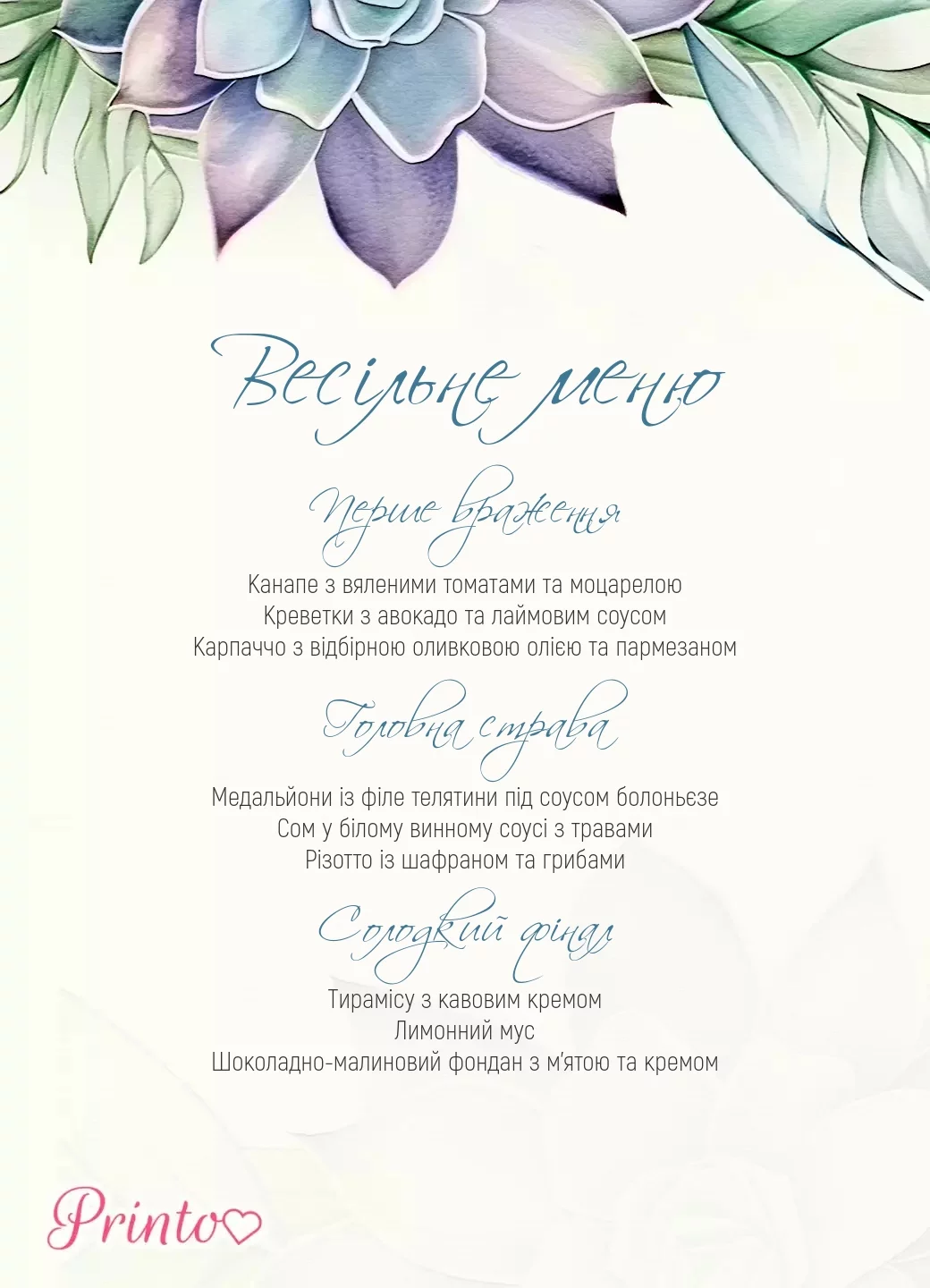 На листі меню зазвичай вказують страви, які будуть подані на весіллі, а також напої і десерти.