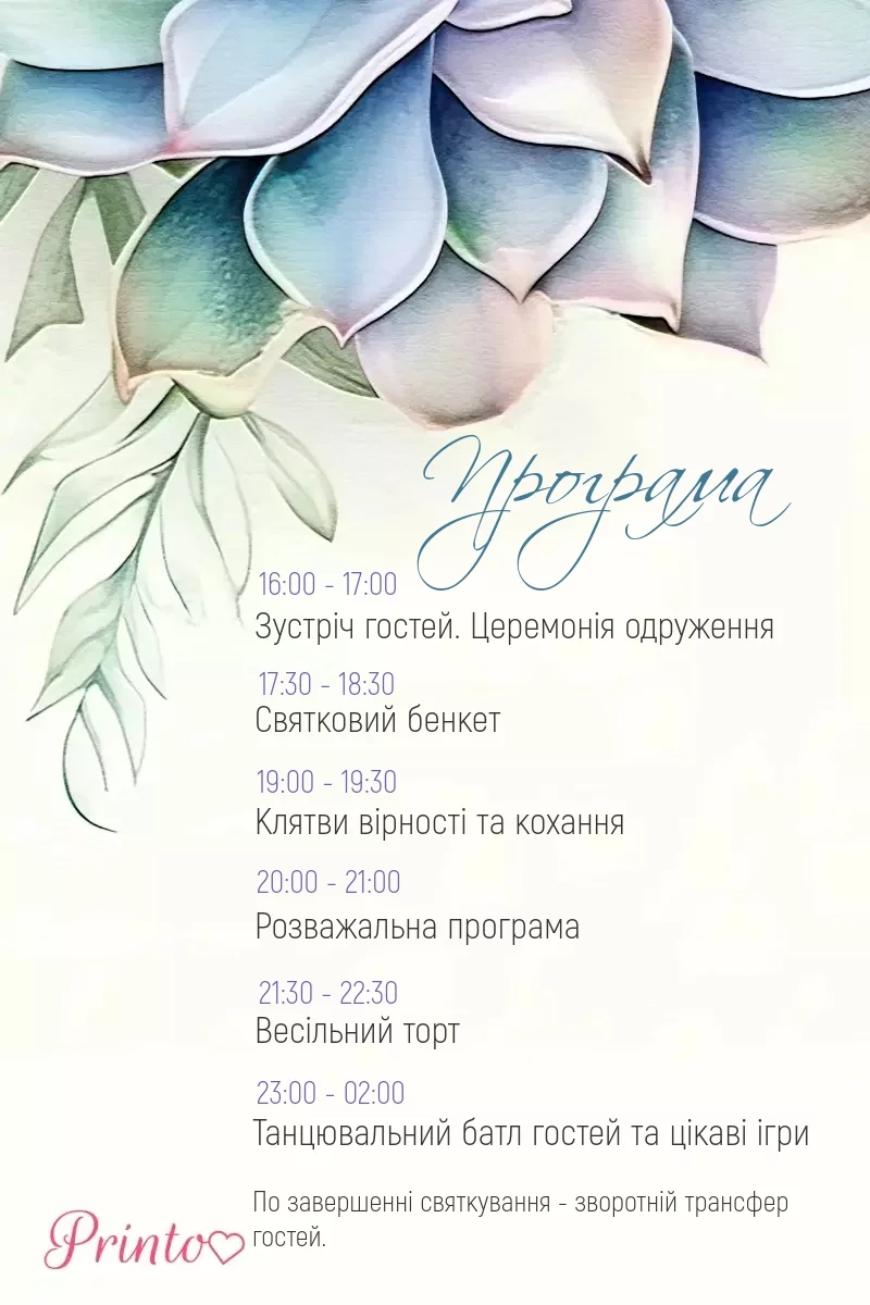 Розкажіть гостям про програму весілля. Вкажіть час початку і закінчення, а також основні заходи.