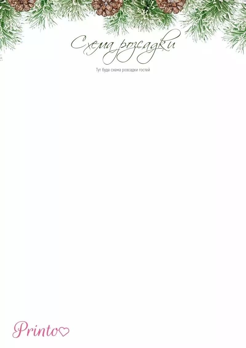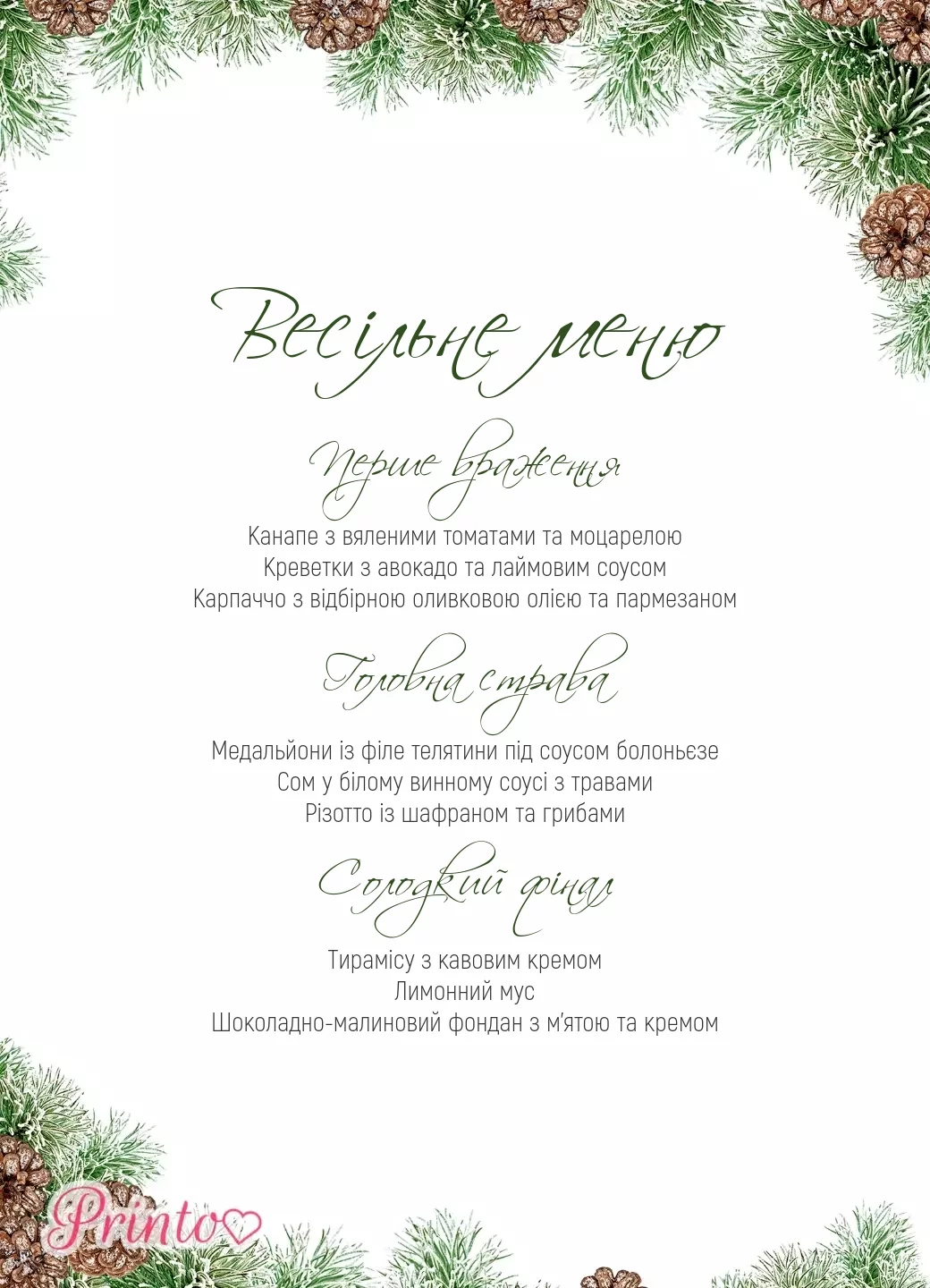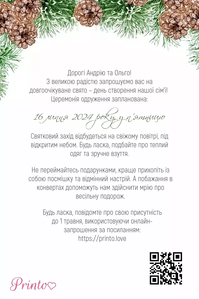 Дизайн весільного запрошення в акварельній техніці, що вирізняється красою та свіжістю зимового лісу. Зелені хвойні гілки з шишками уособлюють міцність, постійність і надійність, що є чудовим символом для такої важливої події, як весілля. Ці елементи додають нотки природної елегантності та класики, роблячи запрошення особливим та незабутнім. Таке запрошення буде радувати гостей і стане прекрасним початком вашого незабутнього свята.