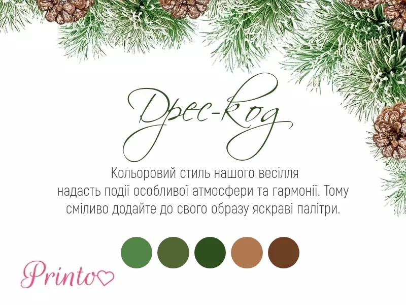 Вкажіть, який дрес-код бажаний на вашому весіллі. Вставте на слайд палітру кольорів, які будуть переважати на весіллі.