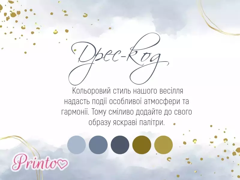 Вкажіть, який дрес-код бажаний на вашому весіллі. Вставте на слайд палітру кольорів, які будуть переважати на весіллі.