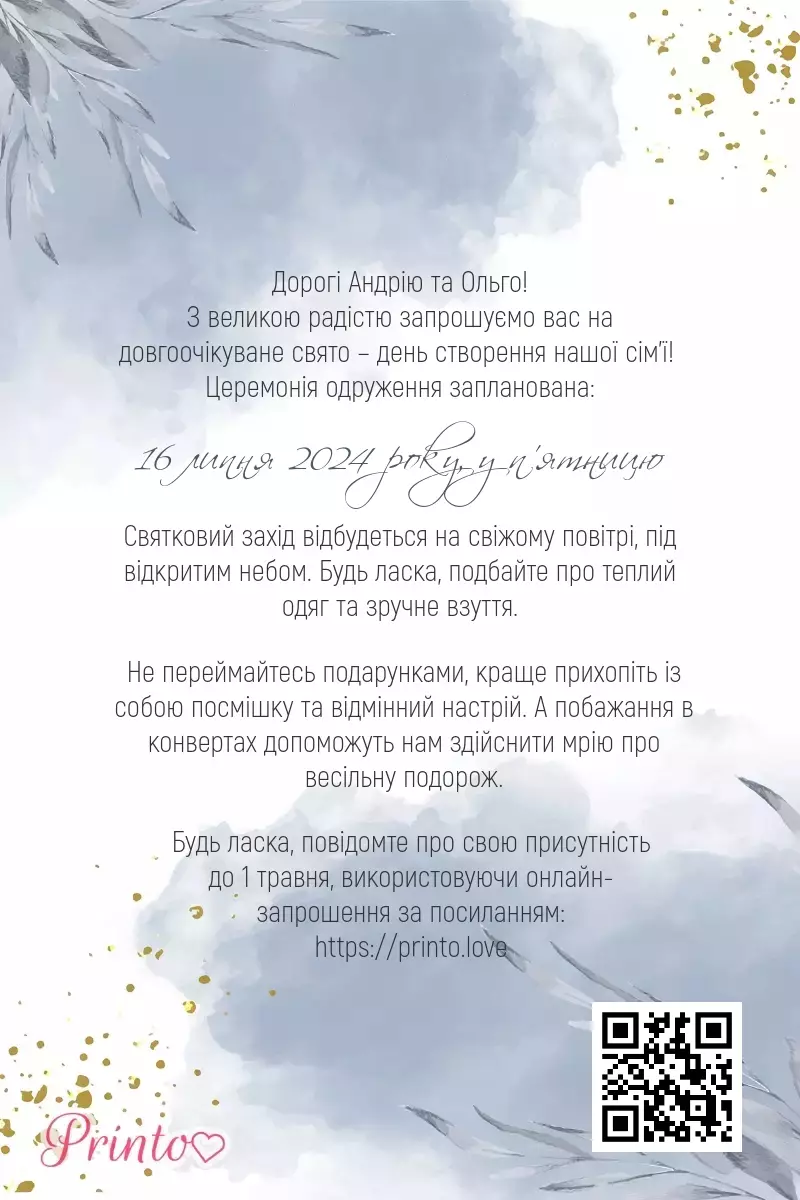 На листі може бути персональне посилання, а також QR-код на іменне цифрове запрошення. Таким чином гості, які отримали друковане запрошення, зможуть дізнатися більше про весілля і підтвердити присутність онлайн.
