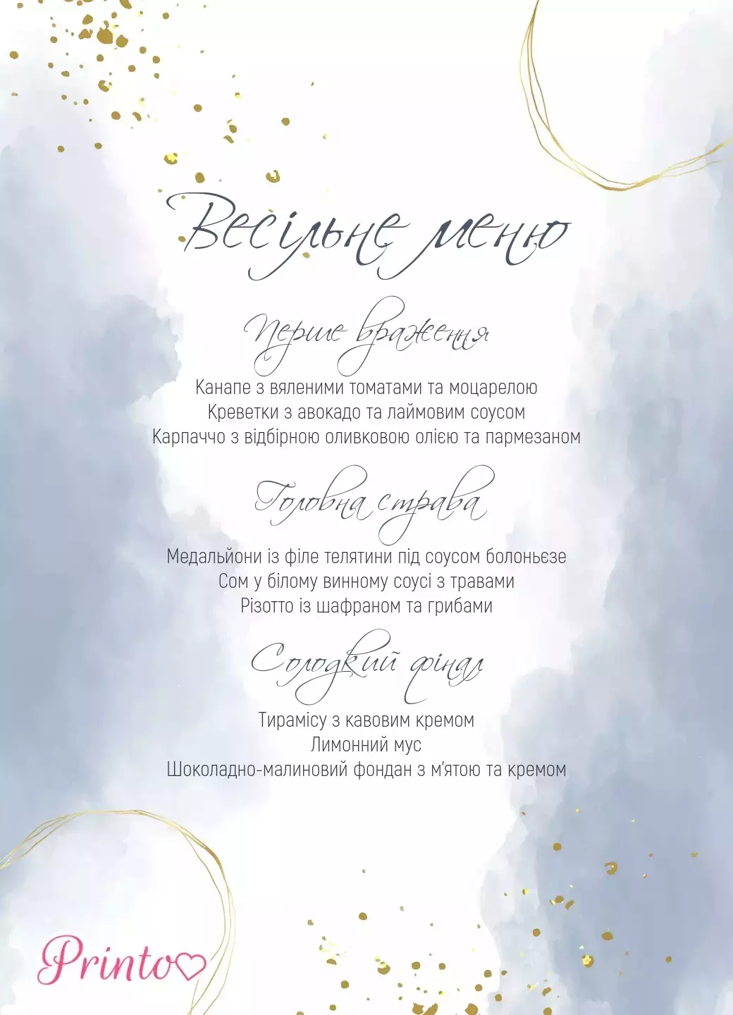 На листі меню зазвичай вказують страви, які будуть подані на весіллі, а також напої і десерти.