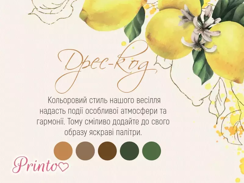 Вкажіть, який дрес-код бажаний на вашому весіллі. Вставте на слайд палітру кольорів, які будуть переважати на весіллі.