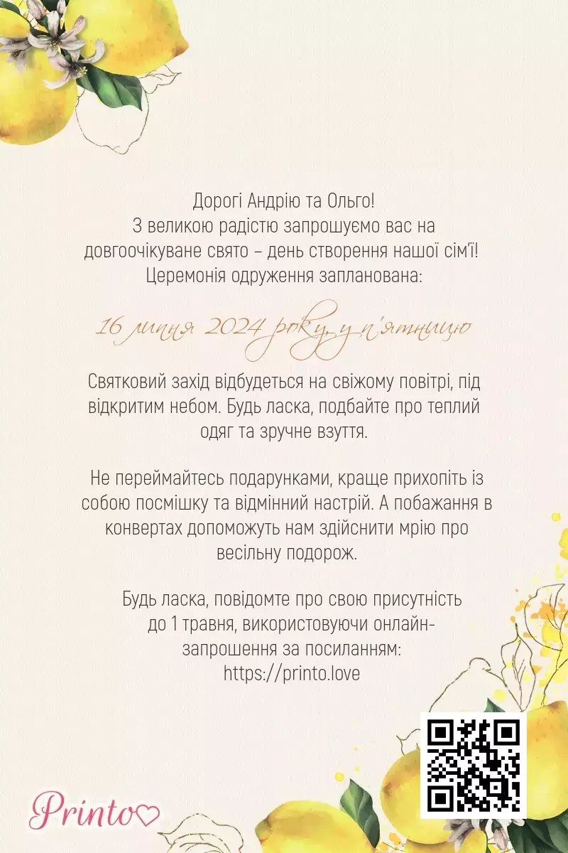 На листі може бути персональне посилання, а також QR-код на іменне цифрове запрошення. Таким чином гості, які отримали друковане запрошення, зможуть дізнатися більше про весілля і підтвердити присутність онлайн.