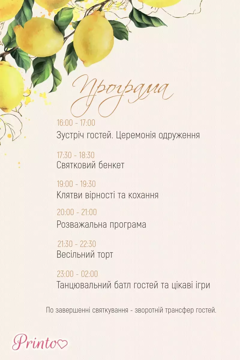 Розкажіть гостям про програму весілля. Вкажіть час початку і закінчення, а також основні заходи.